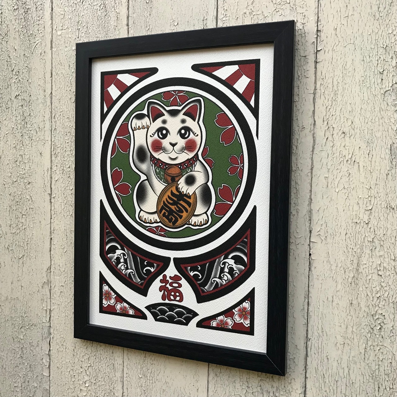 尾九 開運イラスト 招き猫 招福 A4サイズ フレーム付き