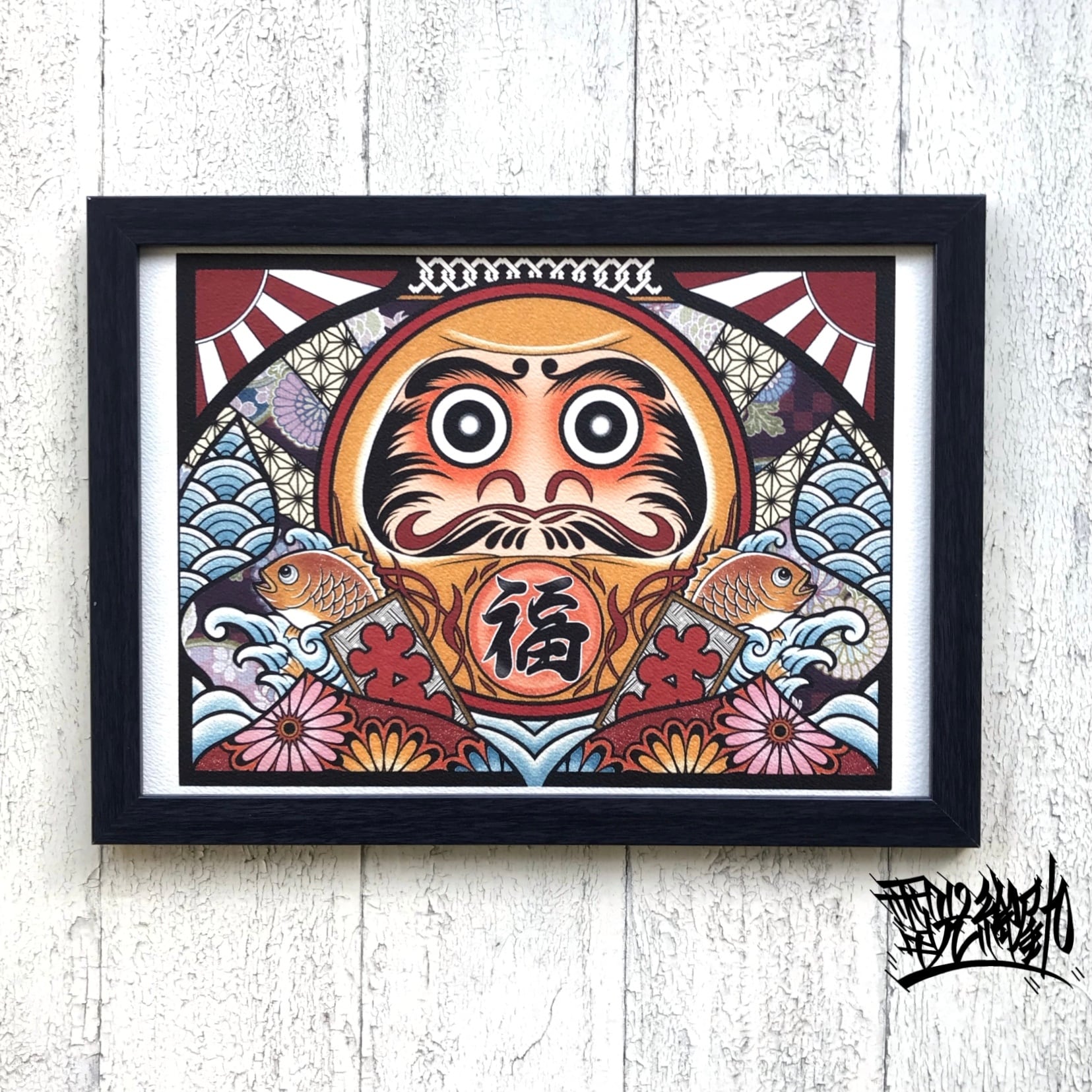 尾九 開運イラスト めで鯛 福達磨 黄色 A4サイズ フレーム付き