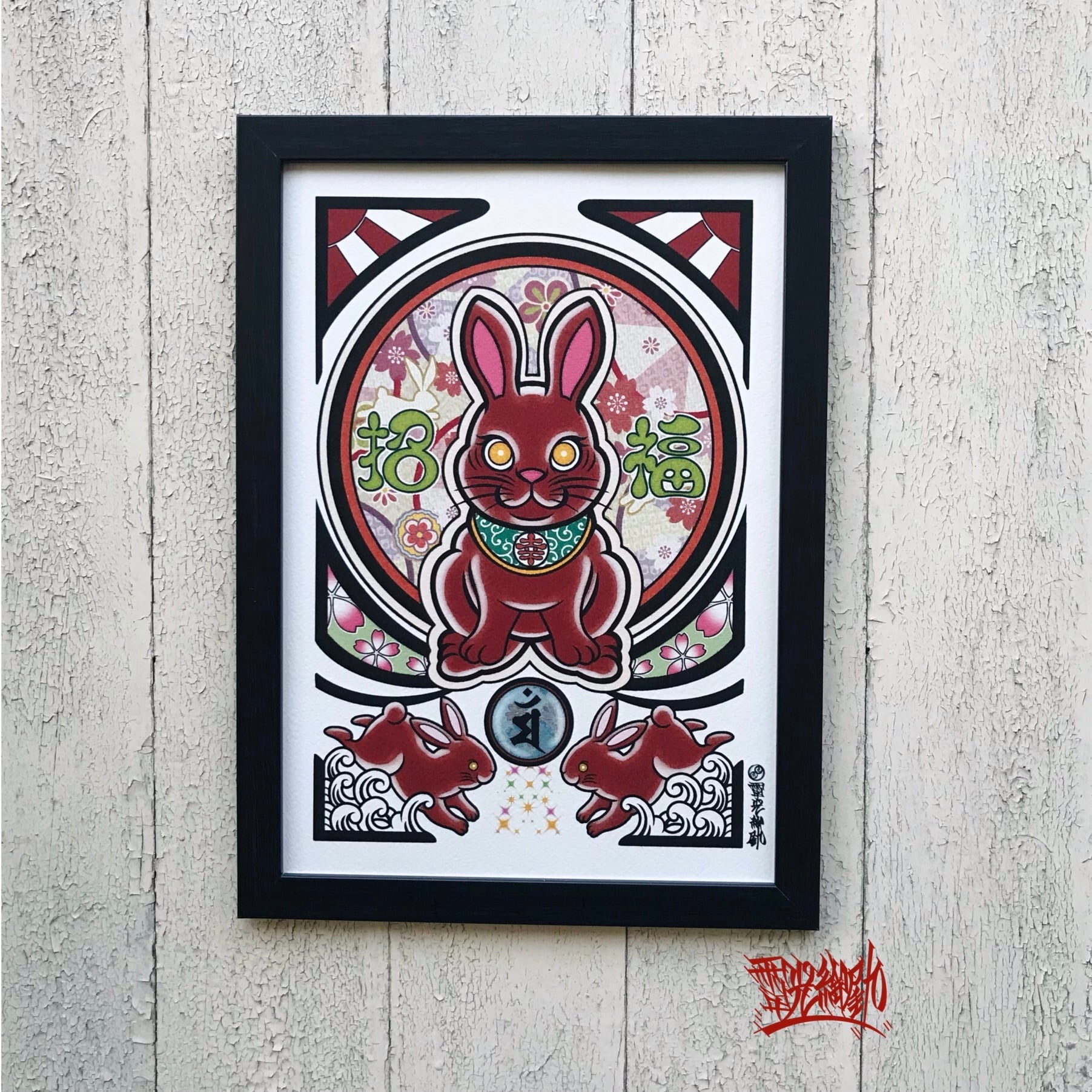 尾九 開運イラスト 梵字 赤兎 招福 A4サイズ フレーム付き